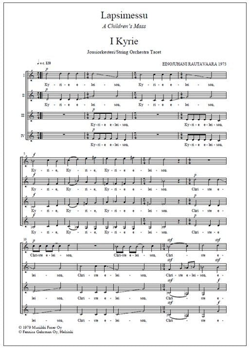 The seven movements of A Children's Mass (1973) by Einojuhani Rautavaara are performed in alternation by a children's choir and string orchestra. Only in the final movement are the two ensembles combined. This arrangement also makes it possible for the choral and orchestral cycles to be performed... Lue lisää