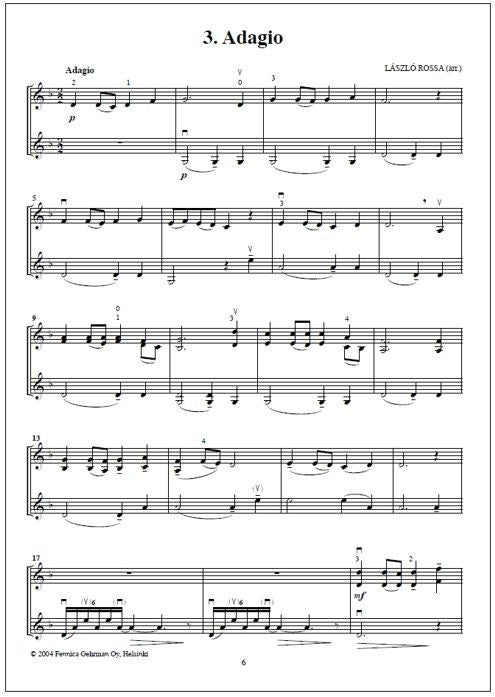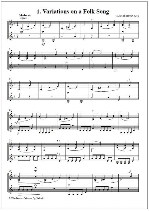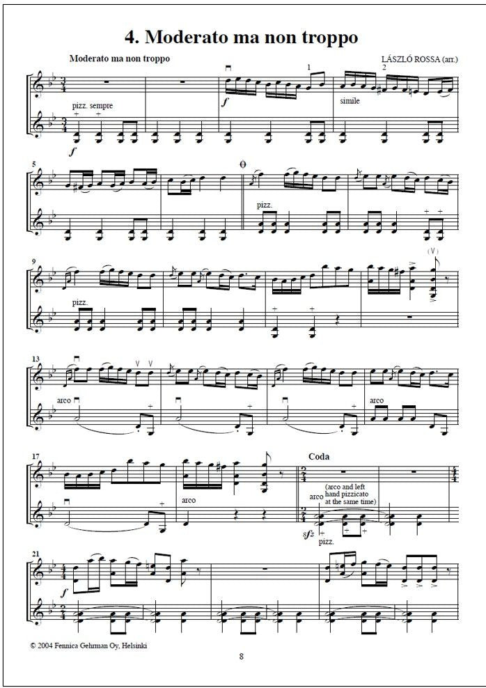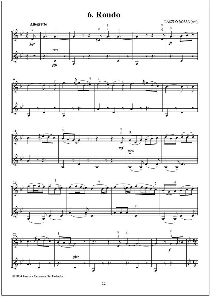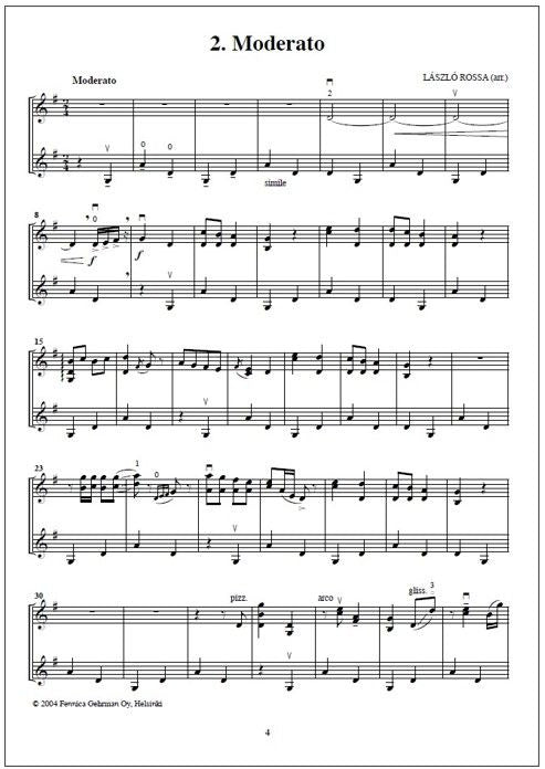 László Rossan sovittamat viuluduot mm. suomalaisista ja unkarilaisista kansanlauluista sisältävät innostavaa yhteissoittomateriaalia ja sopivat oheismateriaaliksi myös viuluryhmien käyttöön. Ne perustuvat Colourstrings-metodiin, mutta sopivat kaikille soittajille. Ensimmäisessä vihkossa oppilas soittaa vapaita kieliä, ja vaativampi stemma on tarkoitettu opettajalle tai pidemmällä olevalle oppilaalle. kurkista sisältöä klikkaamalla ”sample” ja sisällysluetteloa klikkaamalla ”table of contents”.