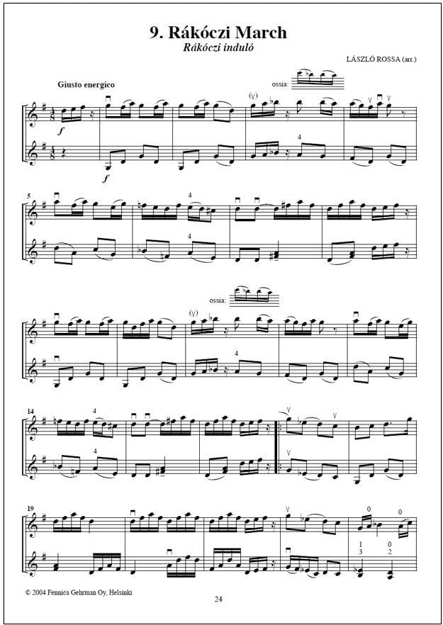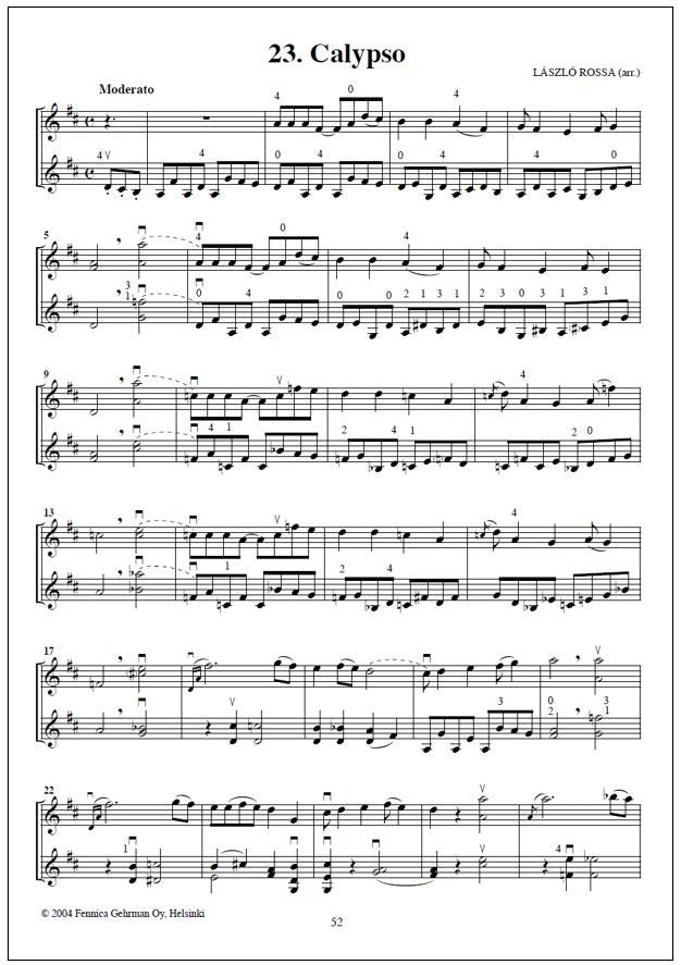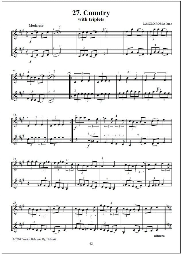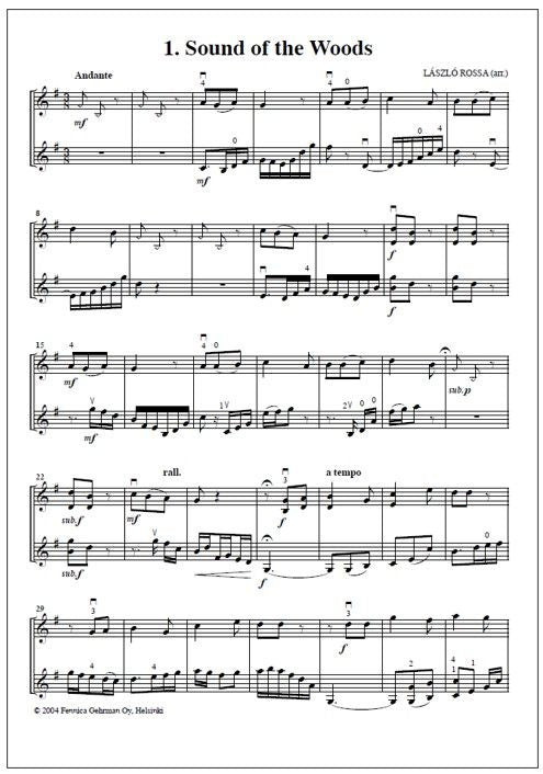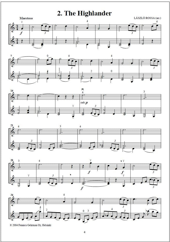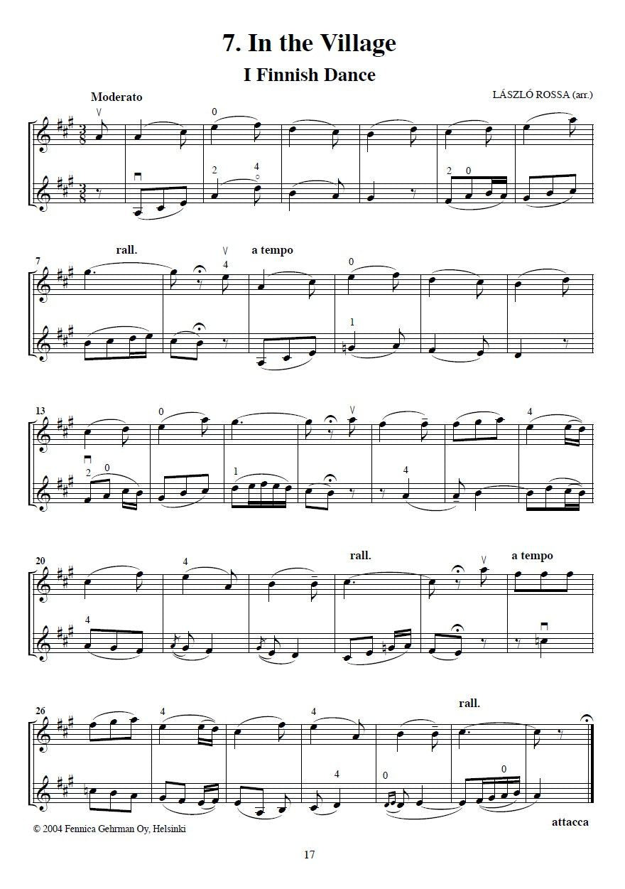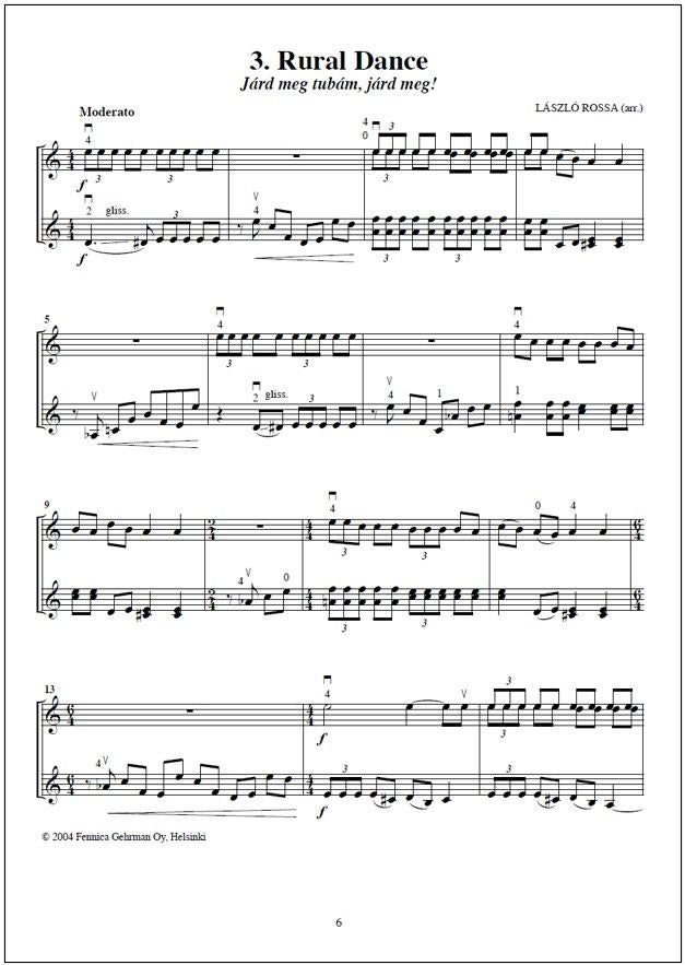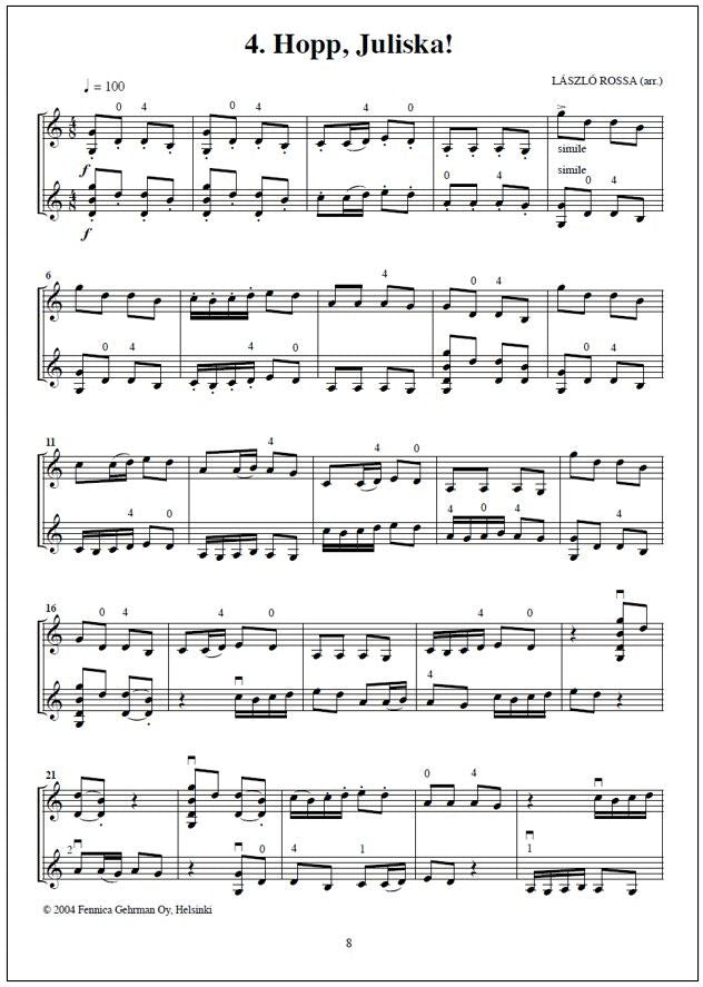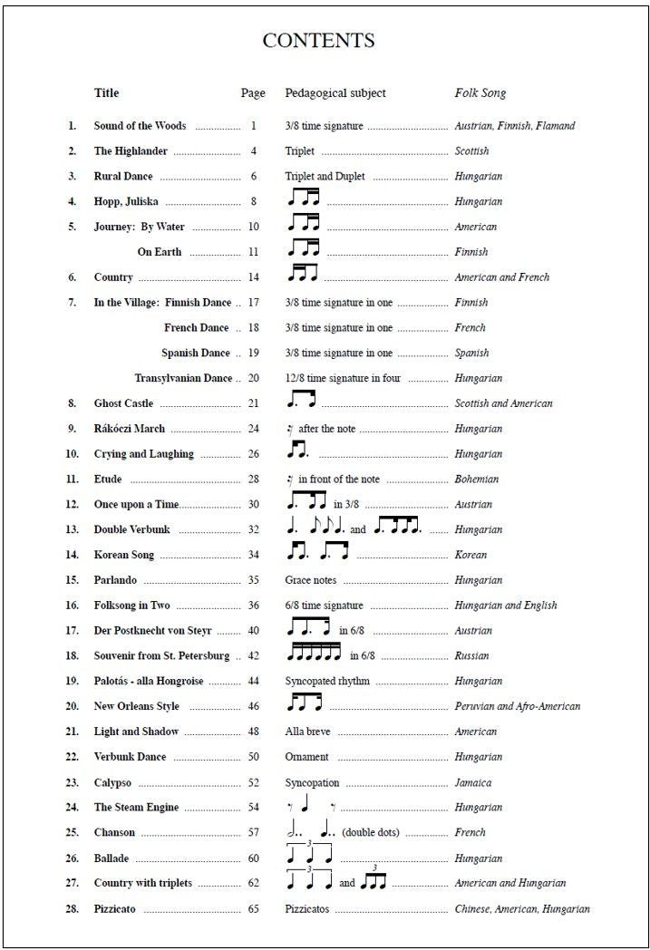László Rossan säkenöivästi sovittamat viuluduot kansanlauluista kaikkialta maailmasta sisältävät innostavaa yhteissoittomateriaalia ja sopivat myös viuluryhmien esityskappaleiksi. Duot luotiin Colourstrings-metodin Yellow Pages -sarjan rytmikuvioita käsittelevien osien oheisohjelmistoksi, mutta ne sopivat kaikille soittajille. Jokainen 28 duosta keskittyy yhden asian - tahtiosoituksen, rytmikuvion, oranmentin tai erilaisten taukojen - opetteluun (katso koko lista klikkaamalla "table of contents"). Viuluduojen volume II -vihossa ensimmäisen viulun osuus on teknisesti helppo vasemman käden osalta: soitettavaa on vain ensimmäisessä asemassa ja käytössä on enimmäkseen 1. ja 2. sormen yhdistelmät. Vaativampi stemma on tarkoitettu opettajalle tai pidemmällä olevalle oppilaalle. kurkista sisältöä klikkaamalla ”sample”.