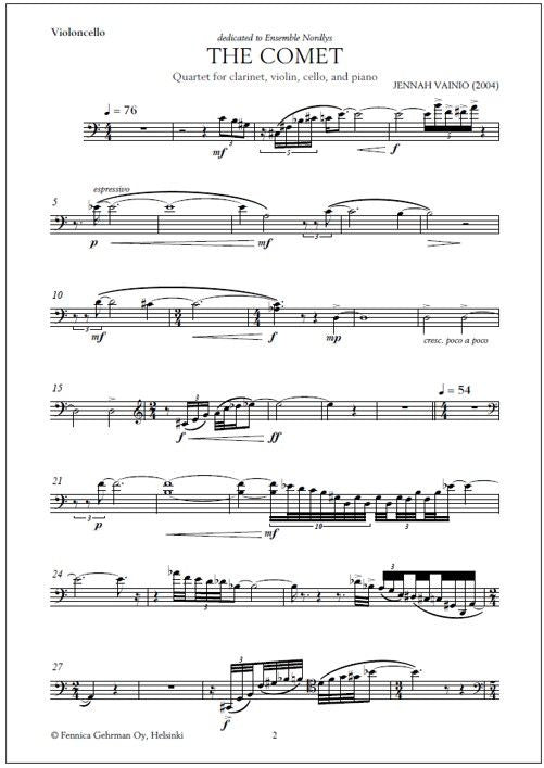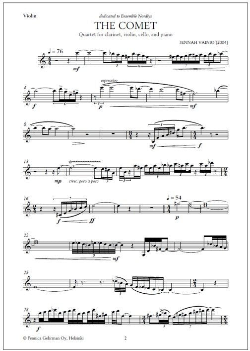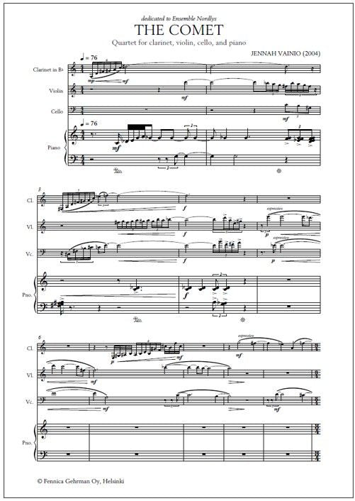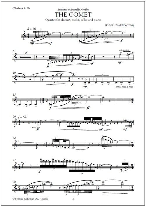 The Comet for clarinet, violin, cello and piano bu Jennah Vainio (2004) was commissioned by the Danish Ensemble Nordlys for their H.C. Andersen 200 Years Project and is dedicated to them. The piece draws its inspiration from the famous author's fairytale of the same title. The piece does not try ... Lue lisää