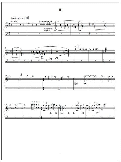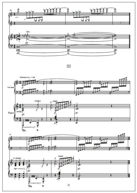 The composer tells about the three-movement work: "The concerto is in three movements. After the orchestral introduction, the harp leads into a gradually thickening texture that progresses into a series of powerful culminations. Once these subside, the expansive motifs of the introduction return. The solo is echoed by two harps in the orchestra: I wanted the magnificent sound to be multiplied. The simple melody in the second movement is coloured in a very archaic way by the orchestra; we might imagine the performance of a troubadour or a bard in ancient times. The finale is festive, 'solenne'. It presents the combined sonority of the three harps at its most colourful and melodic."