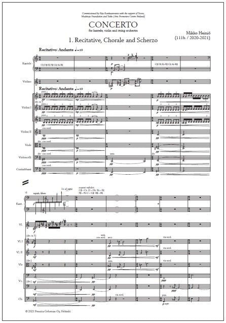 Mikko Heiniö's Concerto for kantele, violin and string orchestra (2020-2021) was commissioned by Eija Kankaanranta and premiered by her, Antti Tikkanen (violin) and the Ostrobothinian Chamber orchestra.