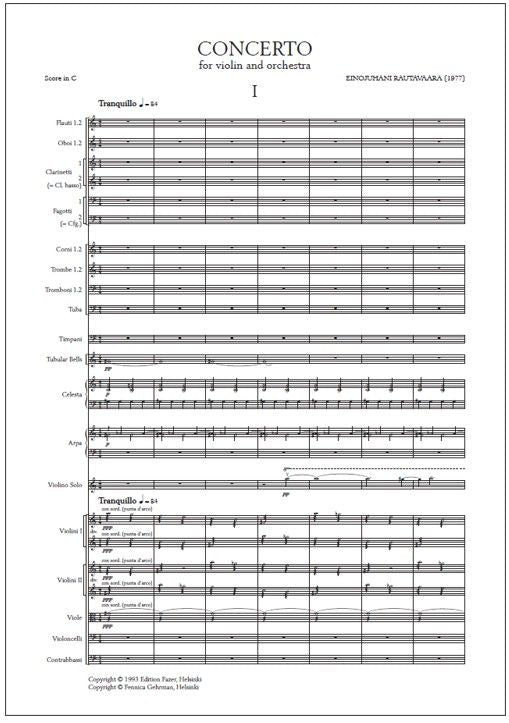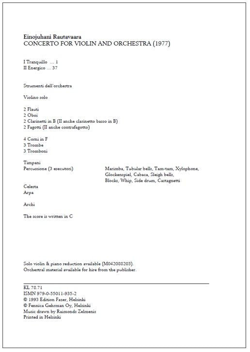 New edition (2024, study score) of Einojuhani Rautavaara's Concerto for violin and orchestra (1977). Milan Kundera compared symphonic music to a journey through a world which has no boundaries. And so it is with the solo violin in this work, which seems to be on a journey where it continually enc... Lue lisää