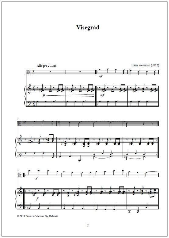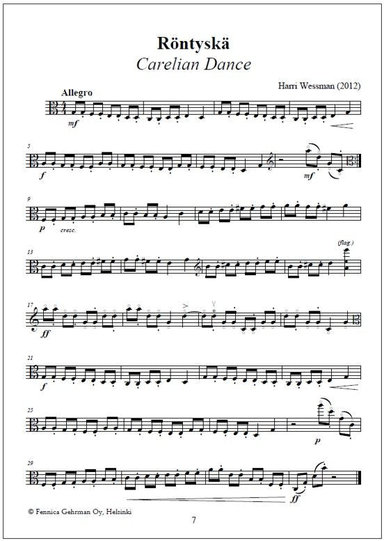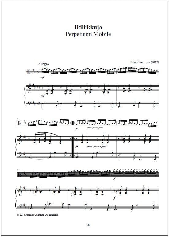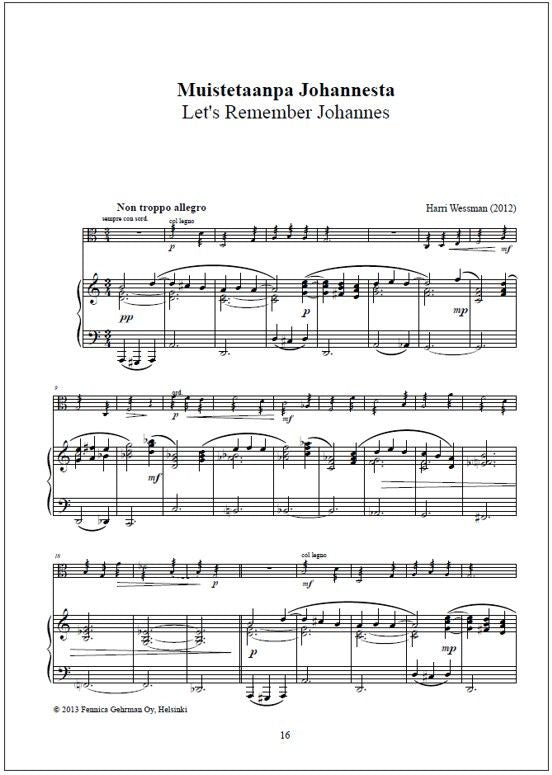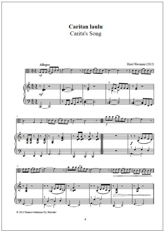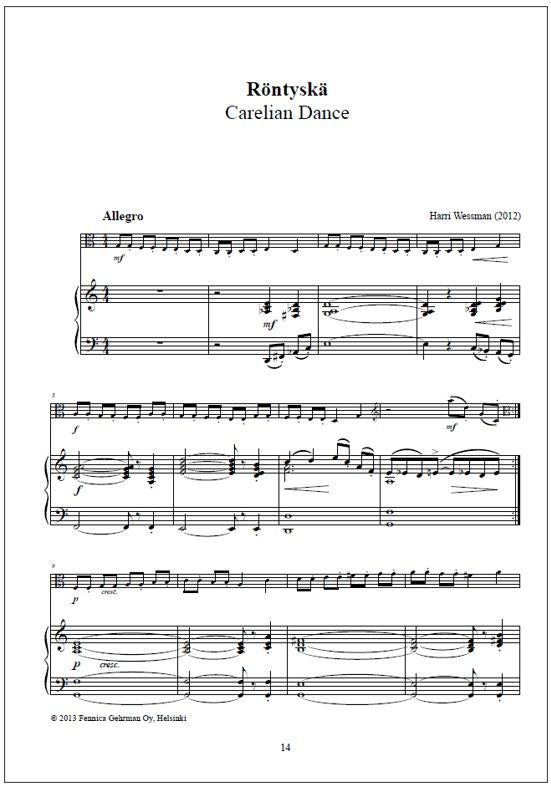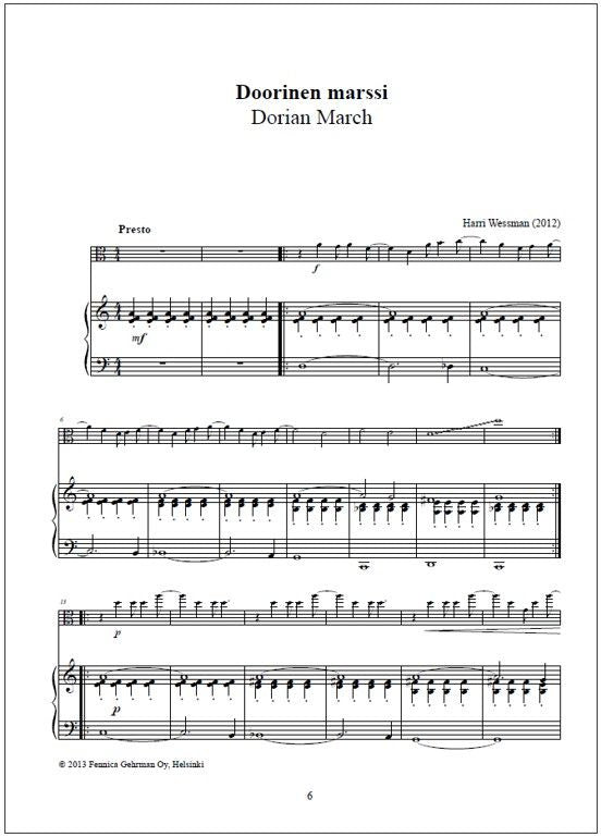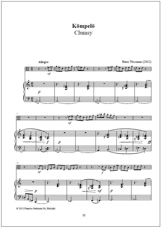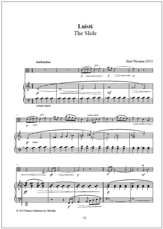 Harri Wessman's compelling and cheerful writing for young musicians results in numerous works. Ellen's viola album (2012) consists of nine pieces for viola and piano. The viola part utilizes flageolets and higher positions, helping the left hand move freely and gain good positions.
