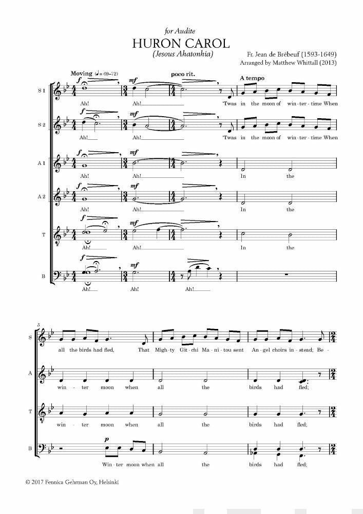 Huron Carol ('Twas the Moon of Wintertime) on mahdollisesti vanhin kanadalainen laulu. Sen sävelsi n. vuonna 1642 Jean de Brébeuf, jesuiittojen lähetyssaarnaaja Saint-Marien lähetysasemalla Huron-kansan parissa. Laulun alkuperäinen teksti oli Huron-kansan kielellä, mutta Whittall käyttää vuoden 1926 englanninkielistä käännöstä. Laulun melodia perustuu ranskalaiseen kansansävelmään "Une Jeune Pucelle". Whittallin sovitus on tehty Audite-kuorolle 2013, ja se tuo taitavasti esiin laulun kauneimmat piirteet.