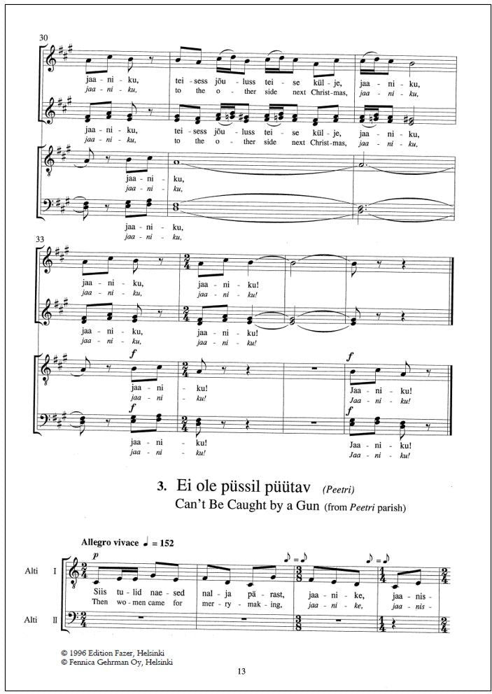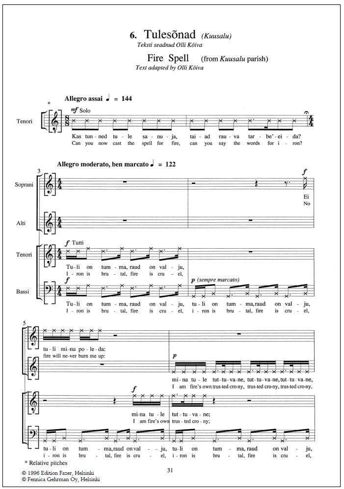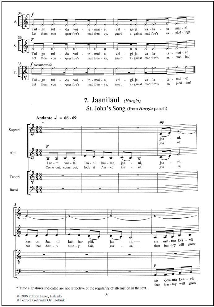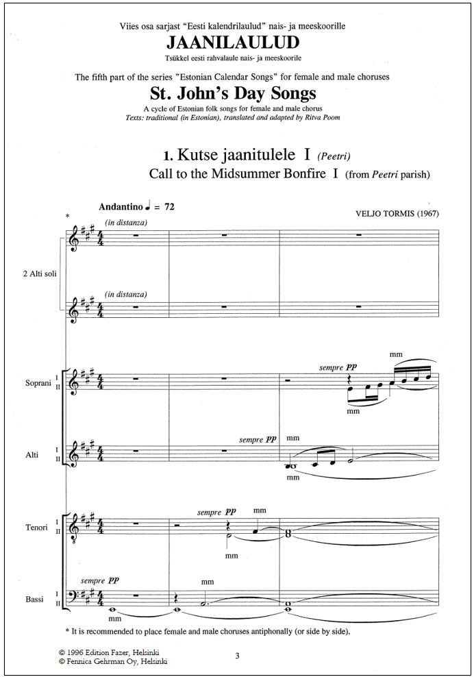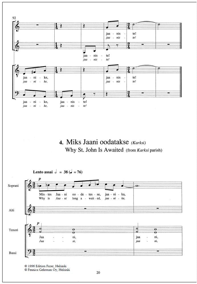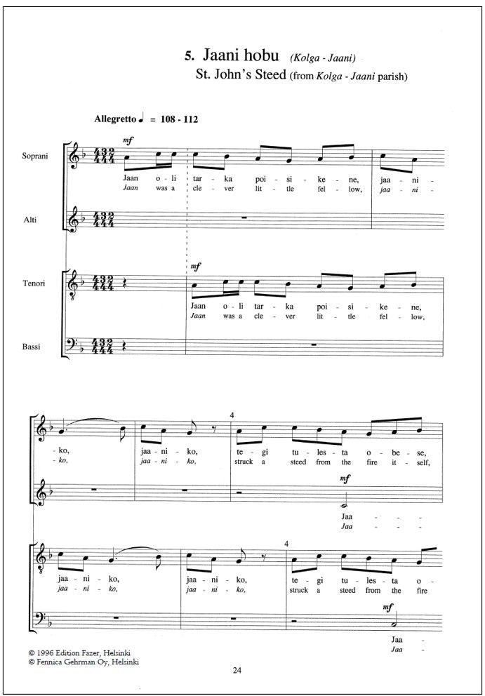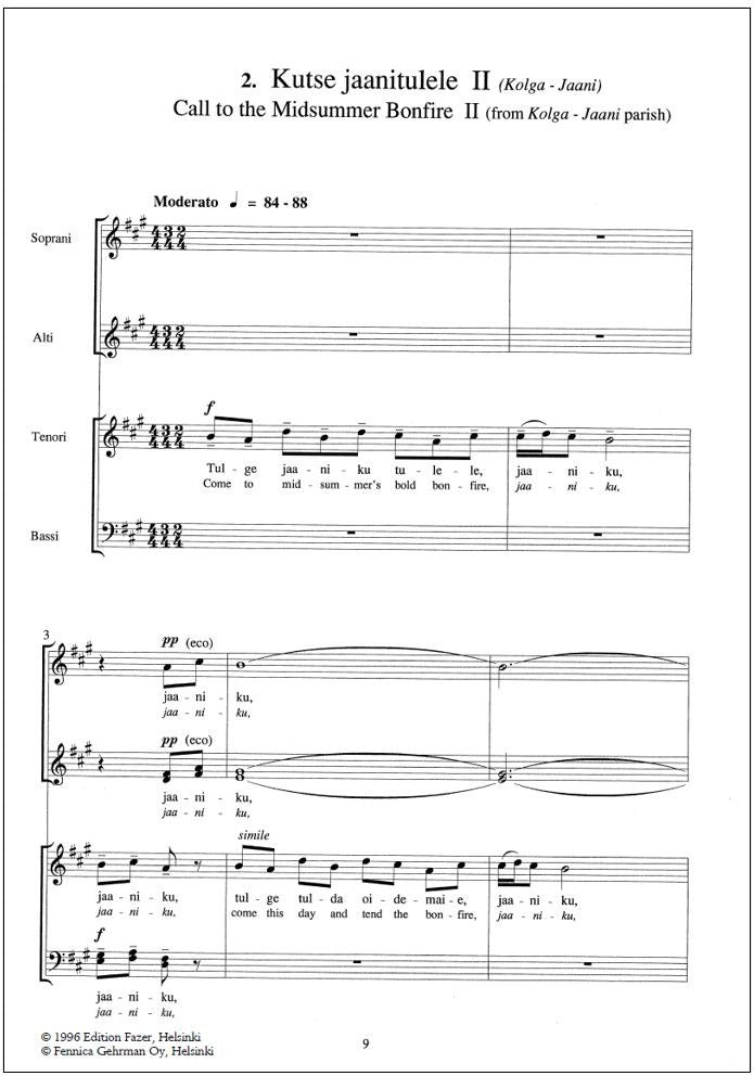 In them the male and female choruses form a magic contrast and together produce a beautiful sound that is both original and unusual. In the last of this set of seven songs (Jaanilaulud) the sopranos are divisi a tre, and each of the other voice parts split into two lines, for a total of nine vocal lines, moving in parallel major triads and parallel seconds and thirds. This song is one of those most frequently sung by itself.