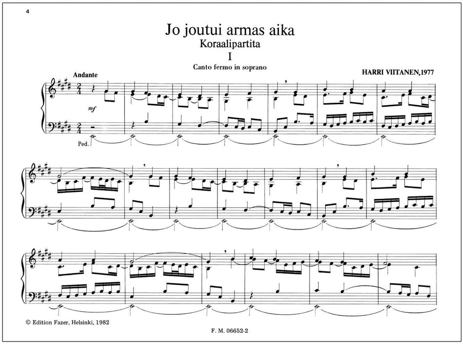 This choral partita for organ by Harri Viitanen (1954-2025) is based on the traditional Swedish summer hymn ("Jo joutui armas aika" - "Den blomstertid nu kommer" - "The sum...