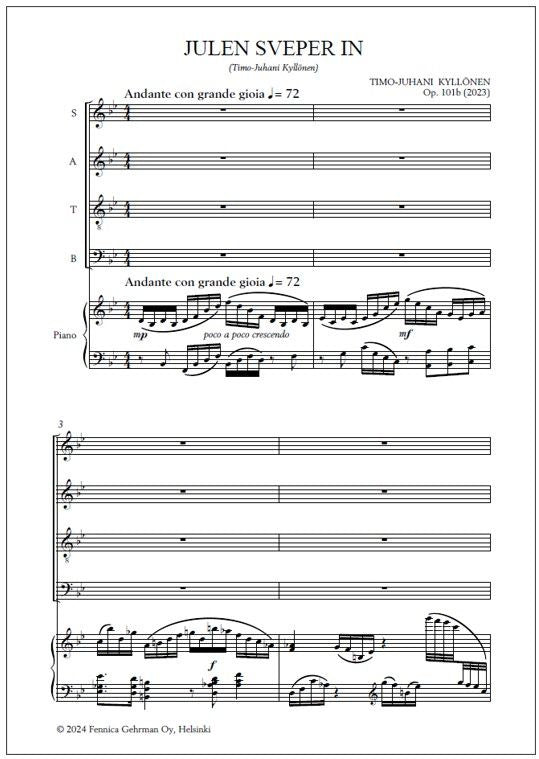 Timo-Juhani Kyllönen's Julen sveper in op. 101b (Swedish, "Christmas sweeps in") for mixed choir and piano was commissioned for Espoo Arbis Chamber Choir in 2023. The composition is about love, peace, light and happiness for humanity. Lue lisää