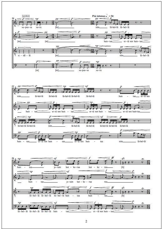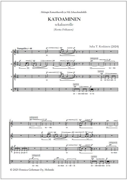 Juha T. Koskinen's Katoaminen (Finnish for "disappearance") for mixed choir strings together elements from a Buddhist shontenza and vocal music by Anton Bruckner and Robert Schumann. The poem in Finnish by Reetta Pekkanen is in dialogue with the shontenza.
