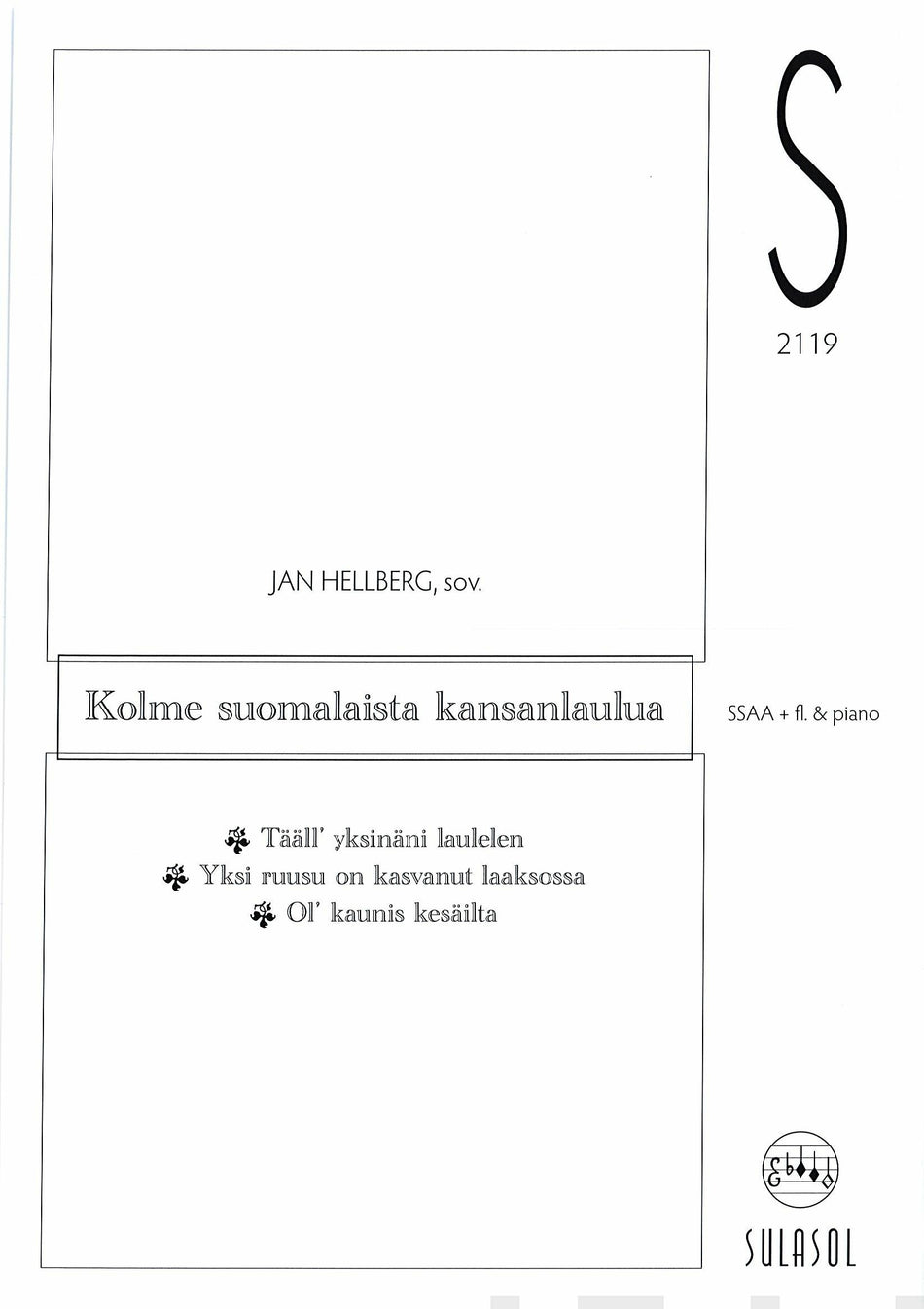 • Alanimike Tääl' yksinäni laulelen : Yksi ruusu on kasvanut laaksossa : Ol' kaunis kesäilta : Diskanttikuoro (SSAA + fl + piano)