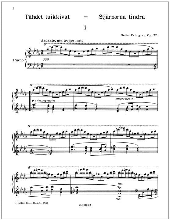 Many of Palmgren's more traditionally Romantic miniatures rank among the gems of Finnish piano music. These include the Kolmikohtauksinen nokturno (Nocturne in Three Scenes, op. 72) dating from 1921.