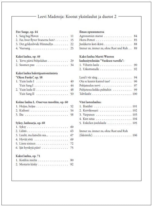 It is between two extremes - the small-scale folk song and the brilliant, impressionistic concert song - that the Madetoja solo songs lie. The complete solo songs and duets in two parts edited by Kimmo Tammivaara includes some pieces that could more or less be classified as utility music. Madetoj... Lue lisää
