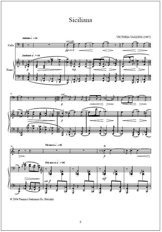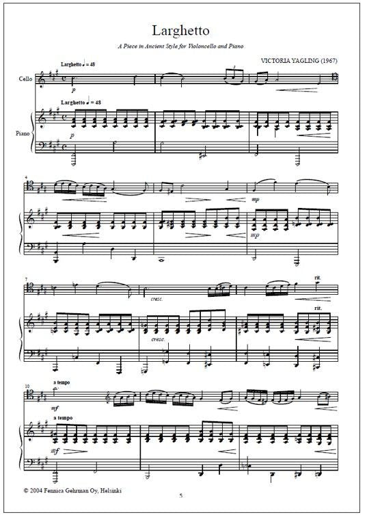 Victoria Yagling's set of two pieces for violoncellon and piano (1967) including Larghetto, a piece in ancient style, and a dance-like Siciliana in 6/8 time.