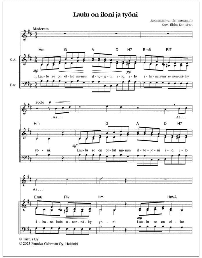 Ilkka Kuusiston sovitus suomalaisesta kansanlaulusta Laulu on iloni ja työni (Laulu se on ollut minun iltojeni ilo) on kirjoitettu sopraano-, altto- ja baritoniäänille sekä sopraanosoolo-obligatolle. Lue lisää