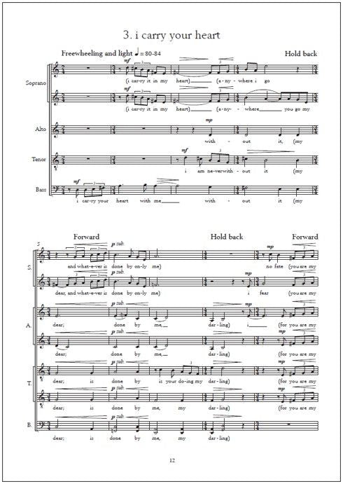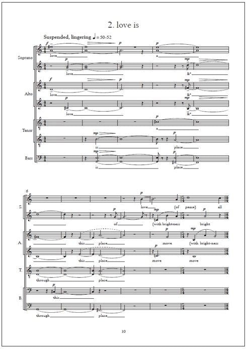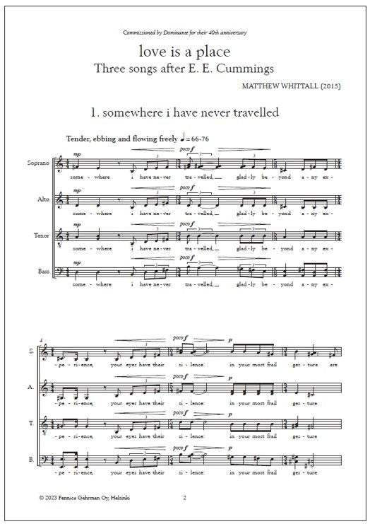 In this set of love songs "love is a place" after one of the great poets of the genre, Matthew Whittall wanted to create a sense of progression from various phases of that universal feeling - falling in love, building a life with a partner, the birth of children, death and loss - but one in which the individual songs could describe any of these stages, and sometimes several. The three songs can be performed in any order, as they all hover around the approximate key of D major and the same soft harmonic palette. The variations in texture are meant to evoke Cummings' idiosyncratic graphic layout, punctuation, and constant parenthetical commentary within his lines, as well as to distill the essence of each mood. "somewhere i have never travelled" is a rhapsodic part song. "love is a place" is suspended in a blissful, near-timeless haze, and "i carry your heart" is an easy polyphonic ballad.