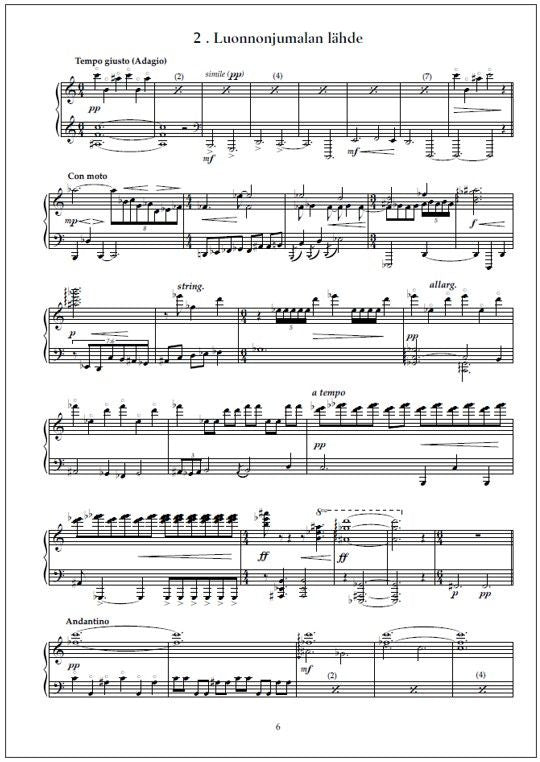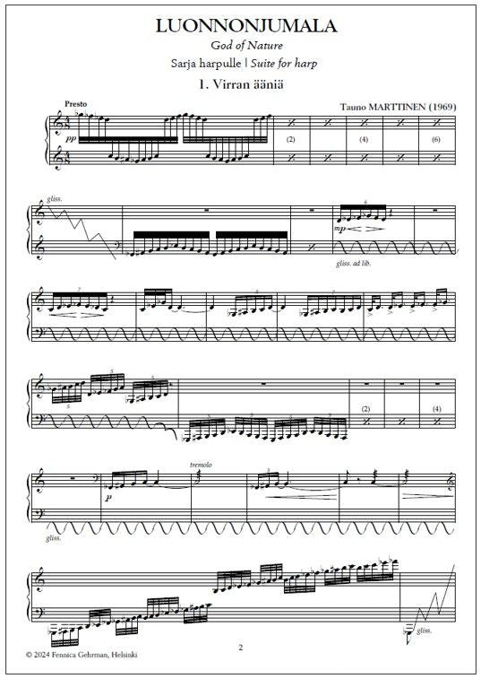 Luonnonjumala (God of Nature) is Tauno Marttinen's adaption for harp of his piano suite Taara op. 34. The manuscript for harp was found in January 2024 by Rauno Marttinen, composer's son.
