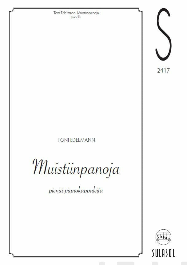 Toni Edelmannin pienet pianokappaleet ovat arvokas ja mielenkiintoinen lisä pianokirjallisuuden alkeisohjelmistoon. Kokoelman teokset on sävelletty pitkällä aikavälillä ja tyylillisesti ne ovat kirjavia, mutta sopivat eritasoisille soittajille. Vaikka kokoelma on tehty pieniä pianisteja ajatellen... Lue lisää