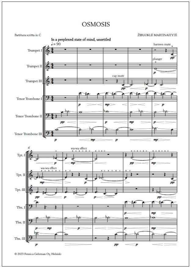 Žibuoklė Martinaitytė Osmosis (2015) is scored for three trumpets and three tenor trombones. The instruments of the 12-minute-work are in osmotic relationships: various degrees of assimilation happen through the subtle variances of rhythmic or melodic contours that often create unified textures w... Lue lisää
