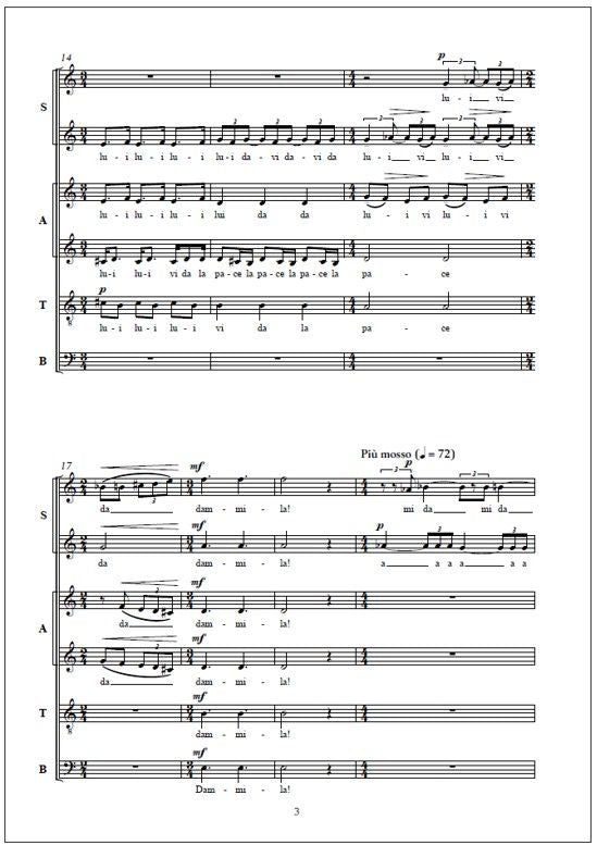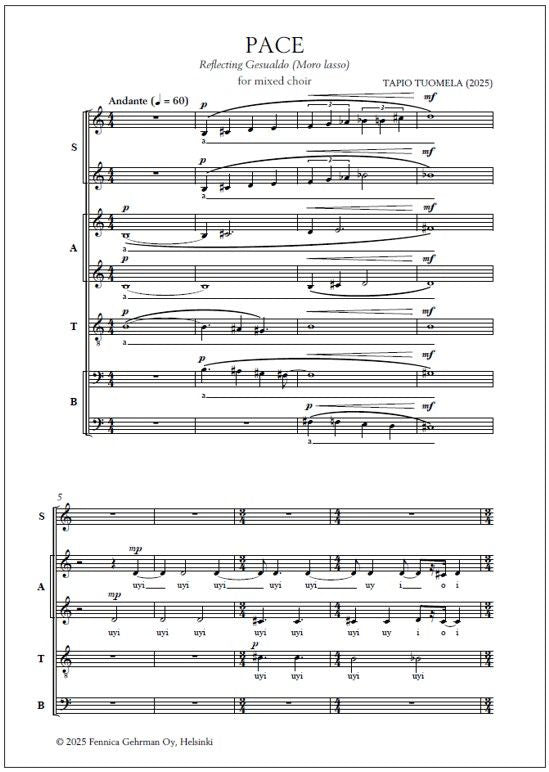 Tapio Tuomela's (b. 1958) Pace for mixed choir (SSAATTBB, 2025) is an appeal for peace, inspired by the enigmatic opening of Carlo Gesualdo's madrigal "Moro, lasso" (1611). A fragment of the Gospel of John is heard recited in the local language of the performance: "Peace I leave with you. My peac... Lue lisää