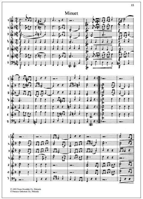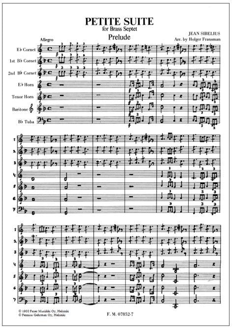 Petite Suite for brass septet consists of Prelude (JS 83, composed in 1891) and Andantino & Menuett (JS 45, composed in 1890/91). This arrangement by Holger Fransman was published for the first time in 1988.