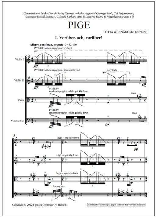 Lotta Wennäkoski's Pige (2021-2022) for string quartet was commissioned to be paired with the Death and the Maiden quartet by Franz Schubert ("pige" is Danish for girl). The composer tells: