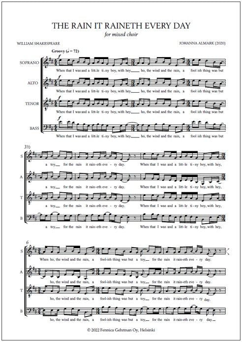 Johanna Almark - singer, orchestra and choral conductor, composer, arranger and violinist - is one of Finland's most versatile musicians. "The rain it raineth every day" is a swinging 21st century madrigal for mixed 5-part choir, set to Feste's song from the The Twelfth Night by William Shakespea... Lue lisää