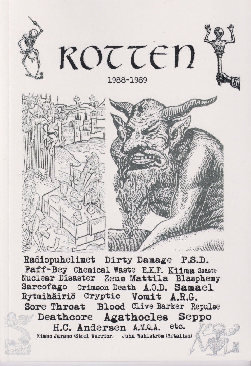Näköispainos kulttimaineessa olevasta Rotten-pienlehdestä. Nykyään pääosin salatieteellisista tutkimuksista ja Gurdjieff-kuvioista tunnettu tietokirjailija Vesa Iitti kunnostautui nuorempana legendaarisen Death metal -yhtyeen Xysman basistina. Näinä aikoina Iitti julkaisi myös Death / Black Metal ja Hardcore -alakulttuureja ja bändejä ruotinutta pienlehteä Rotten, josta ilmestyi vain kaksi numeroa vuosina 1988 ja 1989. Abraxas Publishing päätti julkaista tämän historian havinaan jäänen otannan kotimaista zine-historiaa ROTTEN-ZINE KOKOELMAN muodossa.