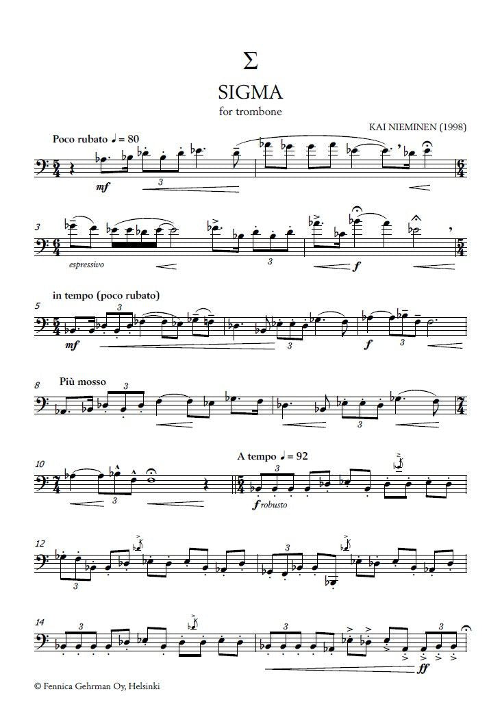 Sigma for solo trombone was written in 1998. Composer tells that inspiration behind the name is from the way trombone's slide moves during playing. The musical material is related to orchestral work ”Le città invisibili” (Invisible Cities, 1998) by Nieminen. The work was written for trombone play... Lue lisää