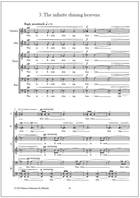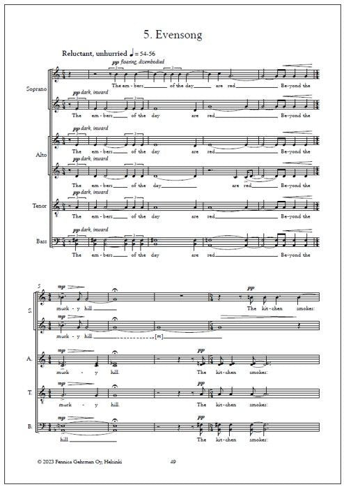 The opening song, Home no more home, presents a simple, ambiguously modal tune at the outset, before sending out tendrils in searching, halting rhythms, a slow, reluctant tread off into the hills, clouded by memory. The middle three songs are brighter in tone, attempting to find solace in a variety of places - in the land, in the firma-ment, on the sea - but all ultimately turn reflectively inward. In the highlands touches on a number of folk traditions, including bagpipe-like strains and a Swedish herding call known as kulning. The infinite shining heavens is a rapt, glowing meditation on the night sky. Give me the sun is an original setting of Stevenson's lyrics for the popular Skye Boat Song, with fragments of the original tune ghosted here and there throughout the texture. The final movement, Evensong, combines three poems on the theme of leave-taking. Here the tone of melancholy becomes one of gentle resignation, not to an ending, but an acceptance of suffering, and of transience.