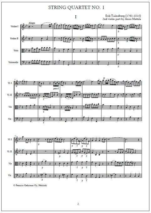 The I violin, viola and cello parts of Tulindberg's String Quartets were discovered in 1923 in the collections of Helsinki University Library. They were copies of the instrumental parts presumably made by Tulindberg himself, though they were possibly never used during his lifetime. Not only is the whole of the II violin part missing; the first movement of the viola part of the fifth Quartet stops in the middle of a phrase, and the last 60 bars or so of the movement's manuscript page are just empty staves.