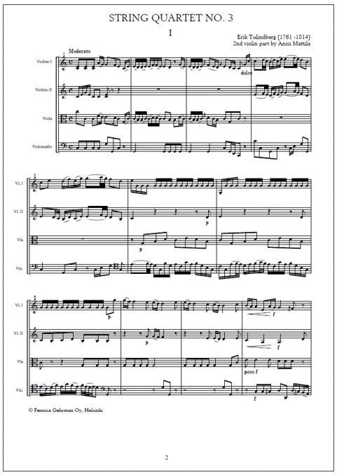 The I violin, viola and cello parts of Tulindberg's String Quartets were discovered in 1923 in the collections of Helsinki University Library. They were copies of the instrumental parts presumably made by Tulindberg himself, though they were possibly never used during his lifetime. Not only is the whole of the II violin part missing; the first movement of the viola part of the fifth Quartet stops in the middle of a phrase, and the last 60 bars or so of the movement's manuscript page are just empty staves.