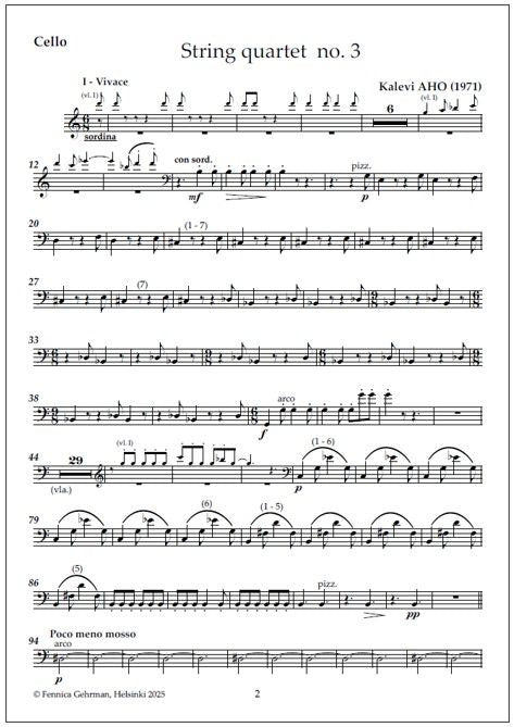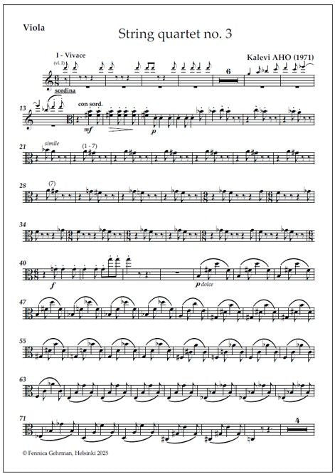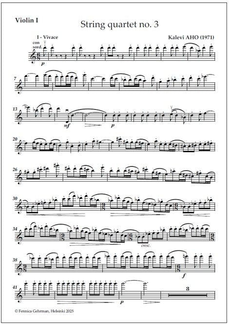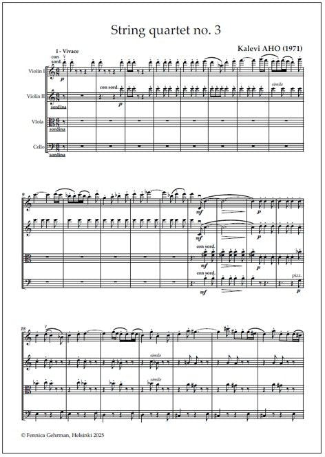 Kalevi Aho's (b. 1949) String quartet no. 3 (1971) comprises eight short sections played in a single movement without pause and is strictly linear in character. The work begins, in all simplicity, with dance music of a rather innocent nature. Gradually, however, the tone of the quartet becomes mo... Lue lisää