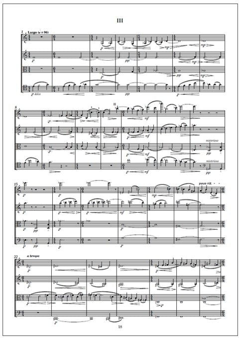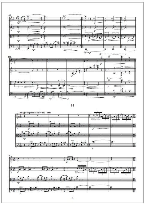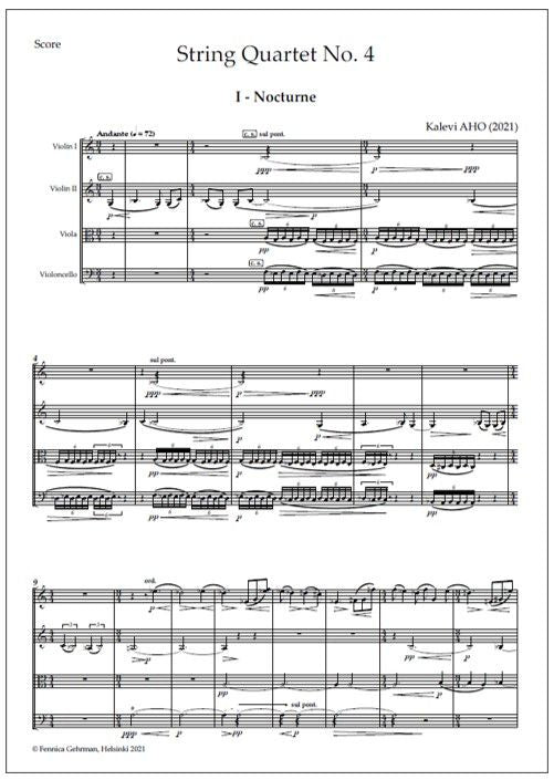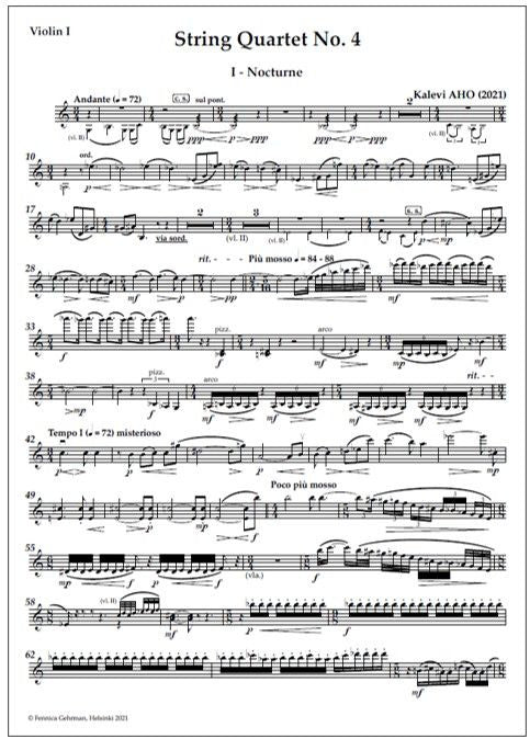 Lasting 27 minutes, Kalevi Aho's String quartet no. 4 (2021) is in four movements. The first, Nocturne, begins with a hazily muted melody dominated by the interval of a minor third on the second violin. Though the first movement begins in nocturnal mood, there is also some more forceful music around the middle. The second movement, Allegro capriccioso, is quick with quirky rhythms. At times tempestuous, it faces the players with the biggest technical and virtuoso challenges. The following Largo is slow. A couple of times in the first half it is dominated by soft, mysterious harmonies. The tempo marking of the virtuosic closing movement is Presto, leggiore. The movement begins with quick, flickering, will-o'-the-wisp-like music. It later builds up to an extremely violent climax dominated by tremolo figures on the second violin and thick chords on the other instruments. The flickering music of the beginning returns at the end, before dissolving into silence.