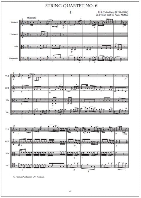 The I violin, viola and cello parts of Tulindberg's String Quartets were discovered in 1923 in the collections of Helsinki University Library. They were copies of the instrumental parts presumably made by Tulindberg himself, though they were possibly never used during his lifetime. Not only is the whole of the II violin part missing; the first movement of the viola part of the fifth Quartet stops in the middle of a phrase, and the last 60 bars or so of the movement's manuscript page are just empty staves.