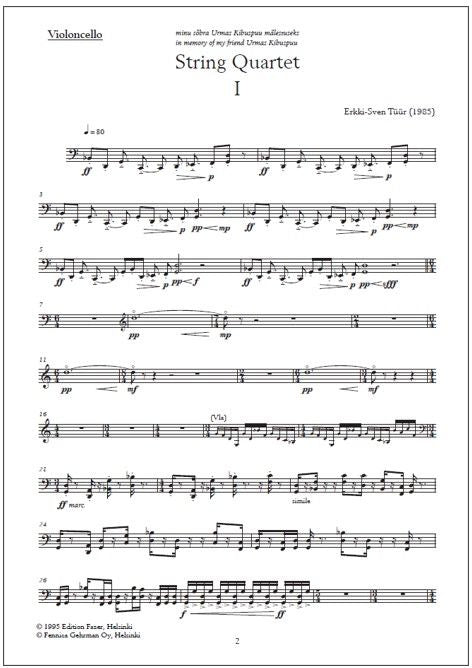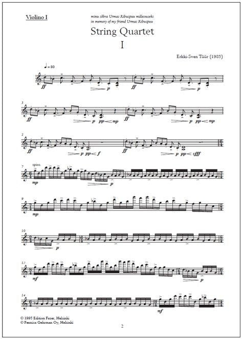 Erkki-Sven Tüür (b. 1959) dedicated his String quartet (1985) dedicated to the memory of his friend, the Estonian actor Urmas Kibuspuu (1953-1985). The impressive two-movement string quarte displays minimalist influences - and the "chamber-rock" spirit of Tüür's early ensemble In spe. The most pronounced ostinato tendencies are in the first violin, which repeats the same motif for several bars while the other instruments accompany it with their own recurring motifs.
