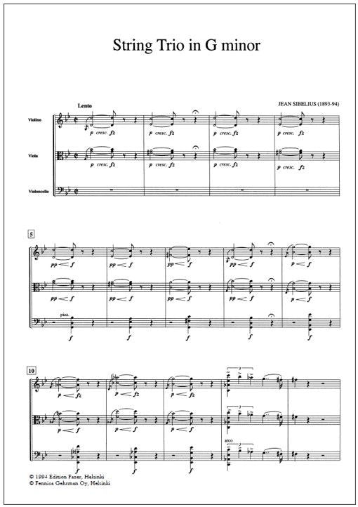The G Minor String Trio (1893-94) is a work of Sibelius's mature chamber music period. It was never finished, and the only completed movement, Lento, has been included in this edition. The work is a combination of various forms and in itself traces a symphonic span. Sibelius used a similar one-mo... Lue lisää