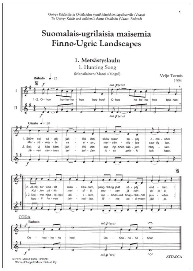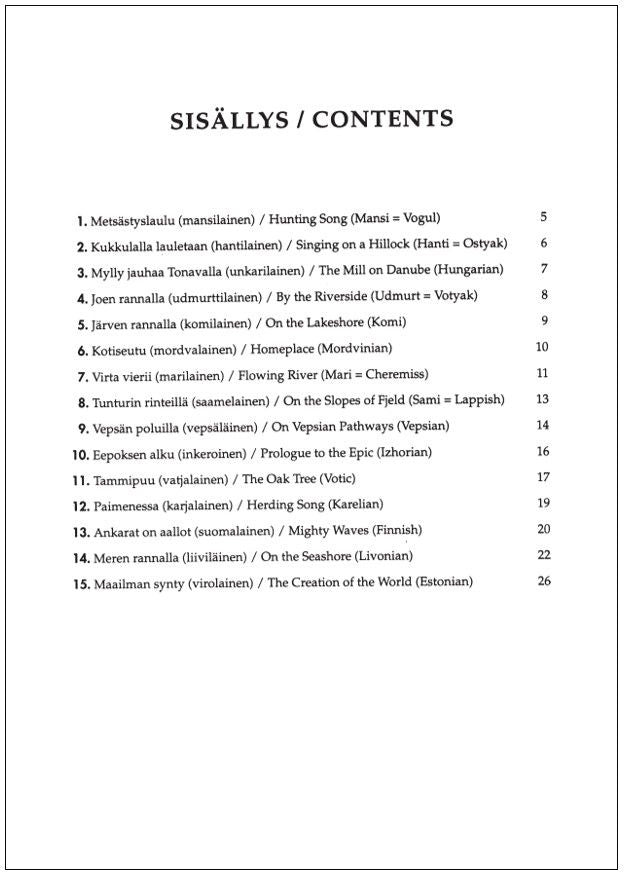 These 15 Finno-Ugric songs are easy material for children's chorus, and at the same time they give a taste of the captivating and primeval energy typical of Tormis's music. The impulse for this sequence came from György Kádár who sent Tormis a letter accompanied by manuscripts of Finno-Ugric folk songs. This extensive material provided Tormis the opportunity to extend his work into a cycle covering all Finno-Ugric cultures. The texts are in 15 different languages with sungable Finnish translations by Sinikka Pohjola. A brief guide for pronounciation is also provided.