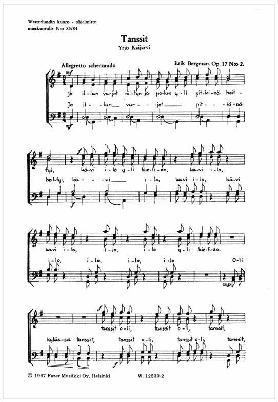 Erik Bergman's (1911-2006) Tanssit op. 17 no. 2 for male choir (TTBB) is set to a poem by Finnish poet Yrjö Kaijärvi (1896-1971). Lue lisää