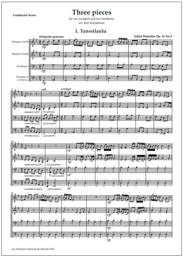 Three pieces for brass quartet is a set of transcriptions by Kari Karjalainen based on Erkki Melartin's (1875-1937) piano works.