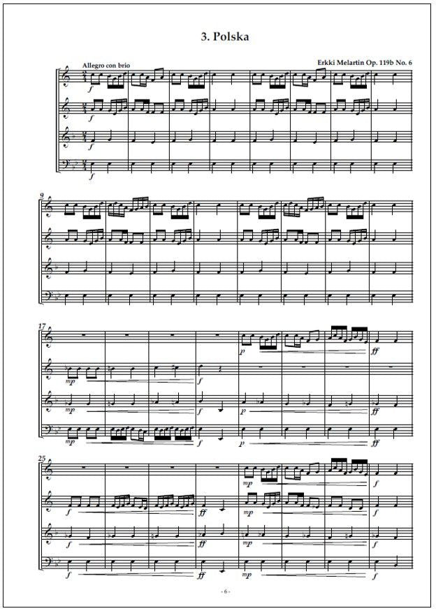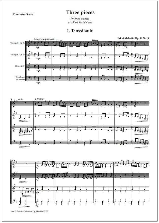 Three pieces for brass quartet is a set of transcriptions by Kari Karjalainen based on Erkki Melartin's (1875-1937) piano works.