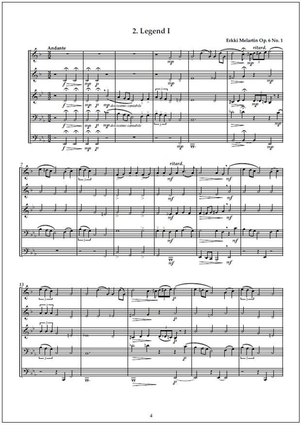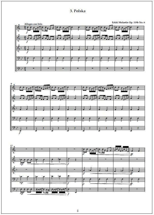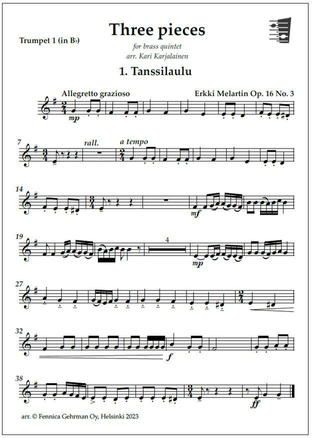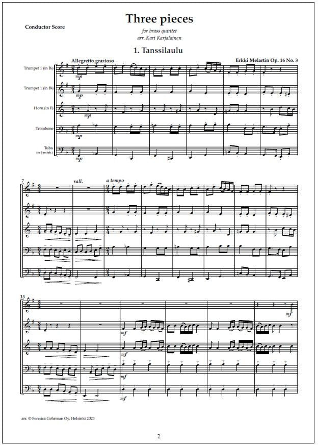 Three pieces for brass quintet is a set of transcriptions by Kari Karjalainen based on Erkki Melartin's (1875-1937) piano works.