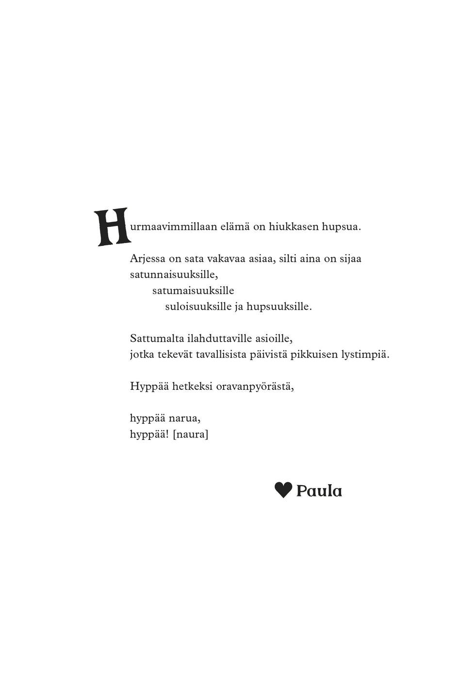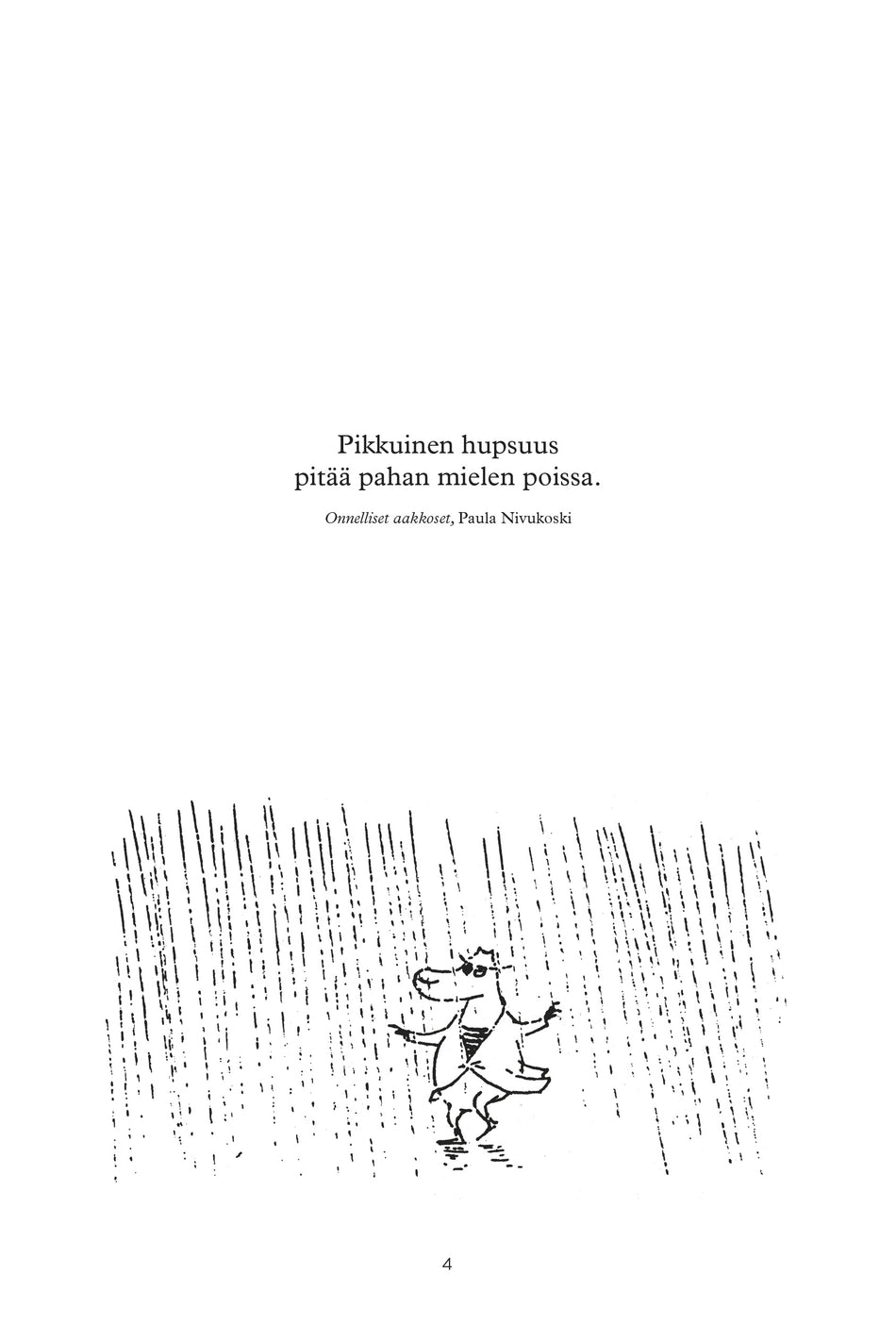 Hupsujen hetkien kirja on täynnä iloa, hauskuutta ja muumimaista huolettomuutta. Se avaa uusia näkökulmia arkipäiväisiin asioihin, ja sen hupaisat pikkutehtävät yllättävät: kuiskaisitko jotain ohikulkijalle, kirjoittaisitko balladin perunankuorimaveitselle tai piilottaisitko viestin kirjaston kirjan väliin?