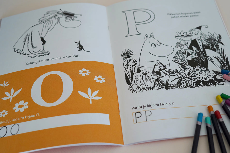 Iloisessa Muumi-värityskirjassa riittää puuhattavaa ja oivallettavaa. Jäljennä kirjaimia ja väritä Tove Janssonin hurmaavia kuvituksia - aakkoset oppii kuin leikiten! Kirjaa maustavat lainaukset Paula Nivukosken Muumi-kirjasta Onnelliset aakkoset.