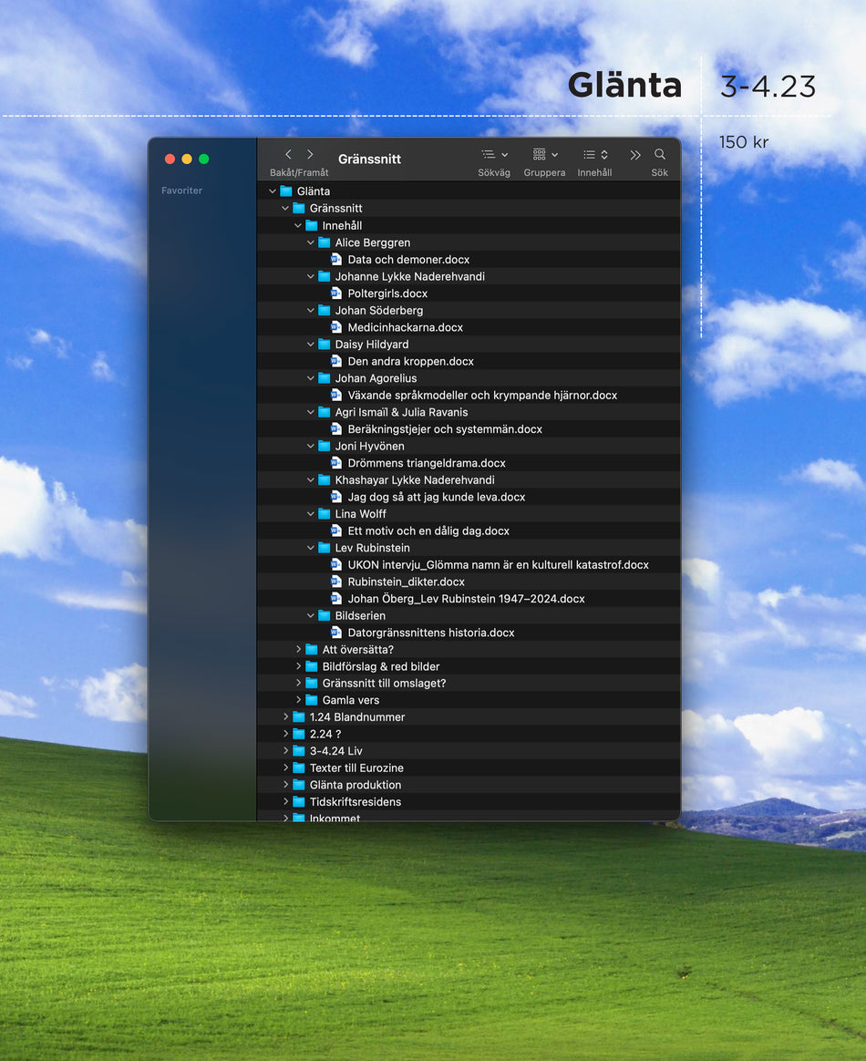 - Kirjoittajat Johan Öberg; Lev Rubinstein; Lina Wolff; Joni Hyvönen; Agri Ismaïl; Johan Agorelius; Daisy Hildyard; Johan Söderberg; Johanne Lykke Naderehvandi