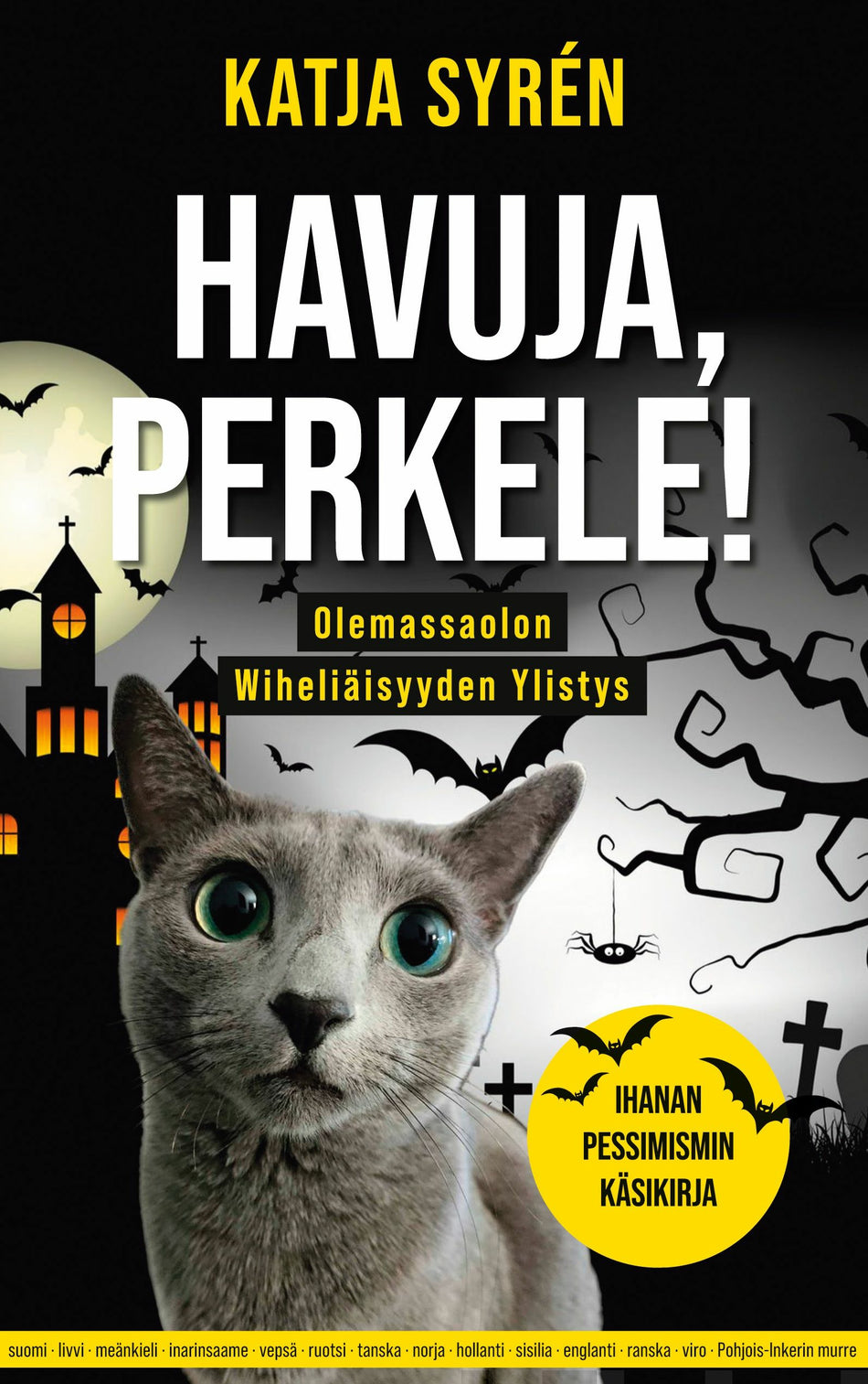 Olemassaolon meille suomat Wiheliäisyydet nyt koottuna yksiin kansiin, 14:llä Euroopan kielellä! Kirja sisältää sanojen, sanontojen, sananlaskujen ja muiden ilmauksien lisäksi ns. varjojen filosofien aforismeja, traktaatteja, tarinanpoikasia sekä gruukkeja. Varjojen filosofeista mukana ovat mm. Arthur Schopenhauer, Giacomo Leopardi, Emil Cioran, Stanisław Jerzy Lec, François de La Rochefoucauld, Piet Hein, Daniil Harms, Søren Kierkegaard sekä Franz Kafka. Kirja venyy olemaan enemmänkin kuin sanakirja: Teos sisältää myös laajahkon puolustuspuheen pessimismin puolesta. HAVUJA, PERKELE!Olemassaolon Wiheliäisyyden Ylistys aka Ihanan pessimismin käsikirja on tiettävästi ensimmäinen milloinkaan julkaistu Olemassaolon Wiheliäisyyteen keskittyvä sanakirja-käsikirja. Tässä Wiheliäisyyden sanakirjat -kirjasarjan ensimmäisessä osassa on mukana kielet: suomi murteineen, livvi, meänkieli, inarinsaame, vepsä, ruotsi, tanska, norja, hollanti, sisilia, englanti, ranska, viro ja Pohjois-Inkerin murre.