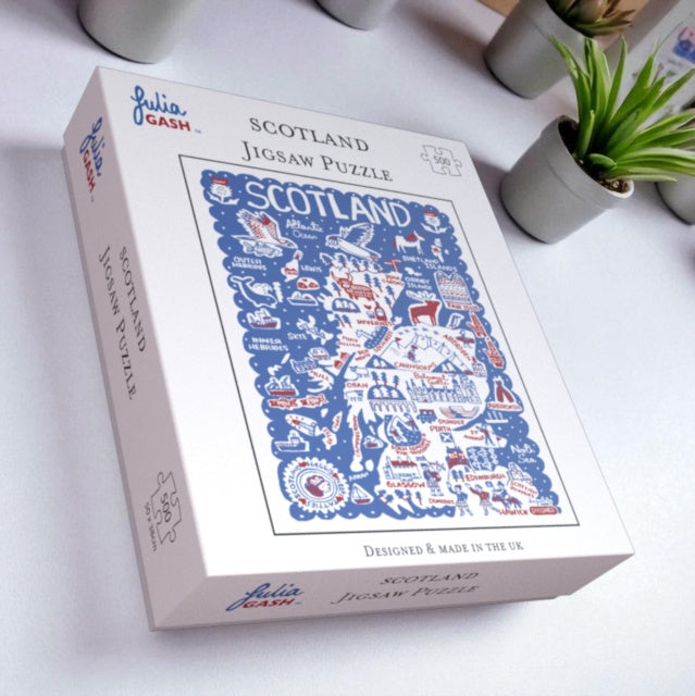 Julia Gash 500 Piece Jigsaw - Scotland. This 500 piece jigsaw puzzle, is fully made in the UK to the highest sustainability standards, chlorine free paper, vegan ink, made from 100% recyclable materials. Featuring some of Scotland's most iconic cities and beautiful landscapes, illustrated by Julia in her spirited handwriting.