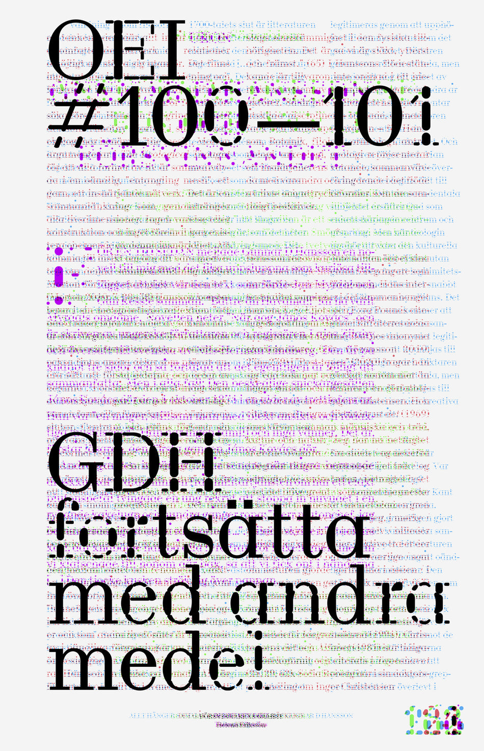 OEI #100–101: GDH / fortsätta med andra medel är ett 496-sidigt jubileumsnummer om och utifrån Gunnar D Hanssons poesi och essäer. Medverkande: Ann Jäderlund, Malte Persson, Skaraborgs museum museum, Johannes Fridholm, Minus Miele, Gunnar D Hansson, Mikael van Reis, Anna Hallberg, Peder Alexis Olsson, Nils Olsson, Thomas Götselius, Jonas (J) Magnusson, Cecilia Grönberg, Gustav Sjöberg, Jörgen Gassilewski, Karl-Magnus Johansson, Ida Lehtonen, Magnus Jacobsson, Jesper Olsson, Filip Lindberg, Lina Hagelbäck, Staffan Söderblom, Jonas Ellerström, Mats Jansson, Leif Nylén, Beata Agrell, Helena Eriksson, Arne Johnsson, Helen Wedham, UKON, Göran Sommardal, Lina Selander, Felice Jackson Rova, Peter Jackson Rova, Jamie McKendrick, Paulina Blaesild, Bengt Berg, Kristian Carlsson, Mia Quirin, Fredrik Nyberg, Johan Redin, Richard Sieburth, Ezra Pound, Jonathan Brott, Lina Rydén Reynols, Peter Törnqvist, med flera