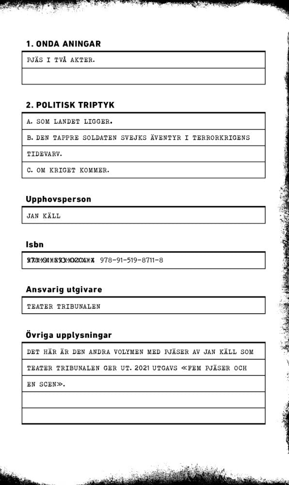 ONDA ANINGAR: berättar i det absurdistiska kammarspelets form den urgamla historien om hur arbetstagarna, när de pressas av arbetsgivaren, i stället för att gå samman och stå enade, vänder sig mot varandra och börjar slåss inbördes. SOM LANDET LIGGER: är en satir över det döende Folkhemmet, en rö... Lue lisää