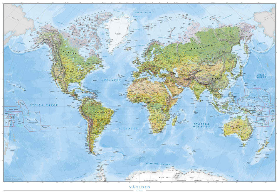 En lagom stor fysisk världskarta! Äntligen en karta med ett format som passar i standardram 100x70cm. Världskartan i skala 1:41,4 miljoner är fysisk och visar genom höjdskuggning tydligt berg och bergskedjor. Den har en ljus, behaglig färgsättning där man ser olika naturtyper som öken, regnskog e... Lue lisää