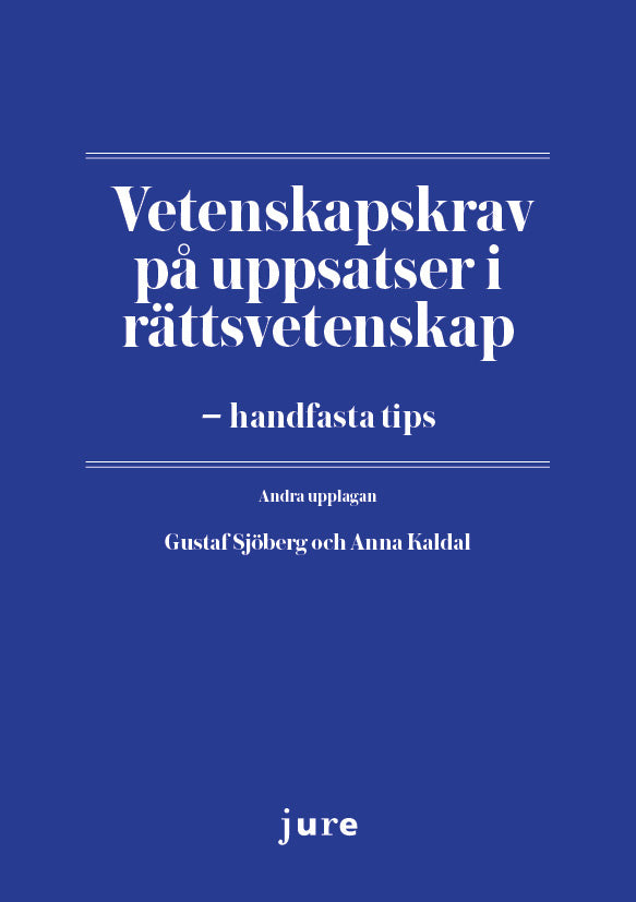 Den här boken handlar om de vetenskapliga kraven på rättsvetenskapligt skrivande. Trots ämnets i grunden teoretiska karaktär är inriktningen att ge praktiska tips för skrivandet. De vetenskapliga kraven är gemensamt för allt akademiskt skrivande. De vetenskapliga kraven skiljer rättsvetenskapen från annan juridisk verksamhet. De är också desamma oavsett vilken form av rättsvetenskapligt skrivande det är fråga om och vilken akademisk nivå det är fråga om. Boken riktar sig till alla som ska skriva ett rättsvetenskapligt arbete, såväl juriststudenter som skriver examensuppsats som andra som med rättsvetenskapliga ambitioner ska skriva en text, oavsett längd. De grundläggande vetenskapliga kraven är nämligen desamma oavsett om det är fråga om en kortare artikel eller en lång monografi, t.ex. en doktorsavhandling. Tanken är att boken ska stimulera eget tänkande. Även om det i betydande grad är fråga om handfasta råd och exempel är avsikten att texten ska uppmuntra till vidare reflektion. Intresset är främst riktat mot det som brukar kallas metodfrågor. Boken handlar dock inte om det som kan kallas materiell metod, vare sig rättsvetenskaplig eller annan. Således behandlas t.ex. inte det materiella innehållet i olika modeller för att tolka lag eller komparativ metod eller vilka element som ingår i genusteori. Huvudbudskapet är att en skribent ska förklara vad som görs samt hur och varför. Och sedan göra det. Upprätthåller hen sedan de vetenskapskrav som vi redovisar i boken behöver det inte vara svårare än så. Gustaf Sjöberg är professor i civilrätt vid Stockholms universitet. Hans forskning är främst riktad mot finansiell reglering och bolagsrätt med inslag av grundläggande rättigheter. Forskningen har oftast ett rättsekonomiskt perspektiv. Han har vidare bred erfarenhet av regelgivning och beslutsfattande på det finansiella området. Han är domarutbildad (assessor i Svea hovrätt) samt juris doktor (Stockholm) och filosofie doktor (Lund). Anna Kaldal är professor i processrätt vid såväl Göteborgs universitet som Stockholms universitet. Hennes forskning är främst inriktad mot rättsprocesser som rör barn och våld i nära relationer. Hon har stor erfarenhet av tvärvetenskapligt arbete genom mötet mellan rättsvetenskap och forskning inom det beteendevetenskapliga kunskapsfältet. Hon är föreståndare för Stockholms barnrättscentrum.